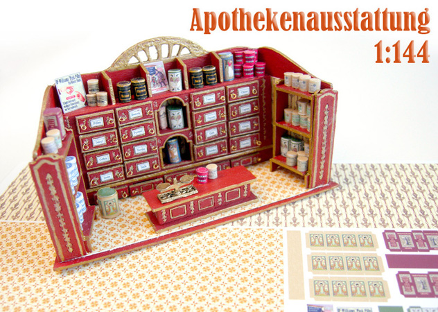 Die Apotheke in 1zu144 Den Bausatz hab ich meinem Projekt angepaßt und die obere Regalverzierung abgesägt. Dadurch kann man die "Auslagen" besser dekorieren.
